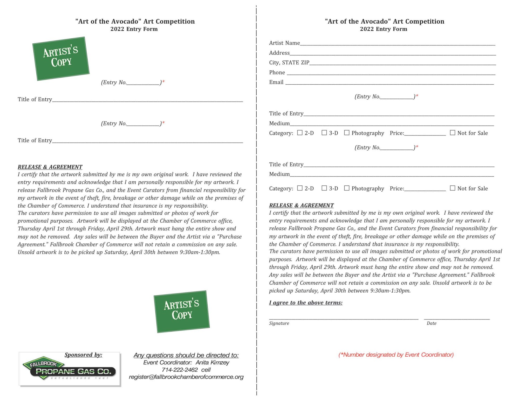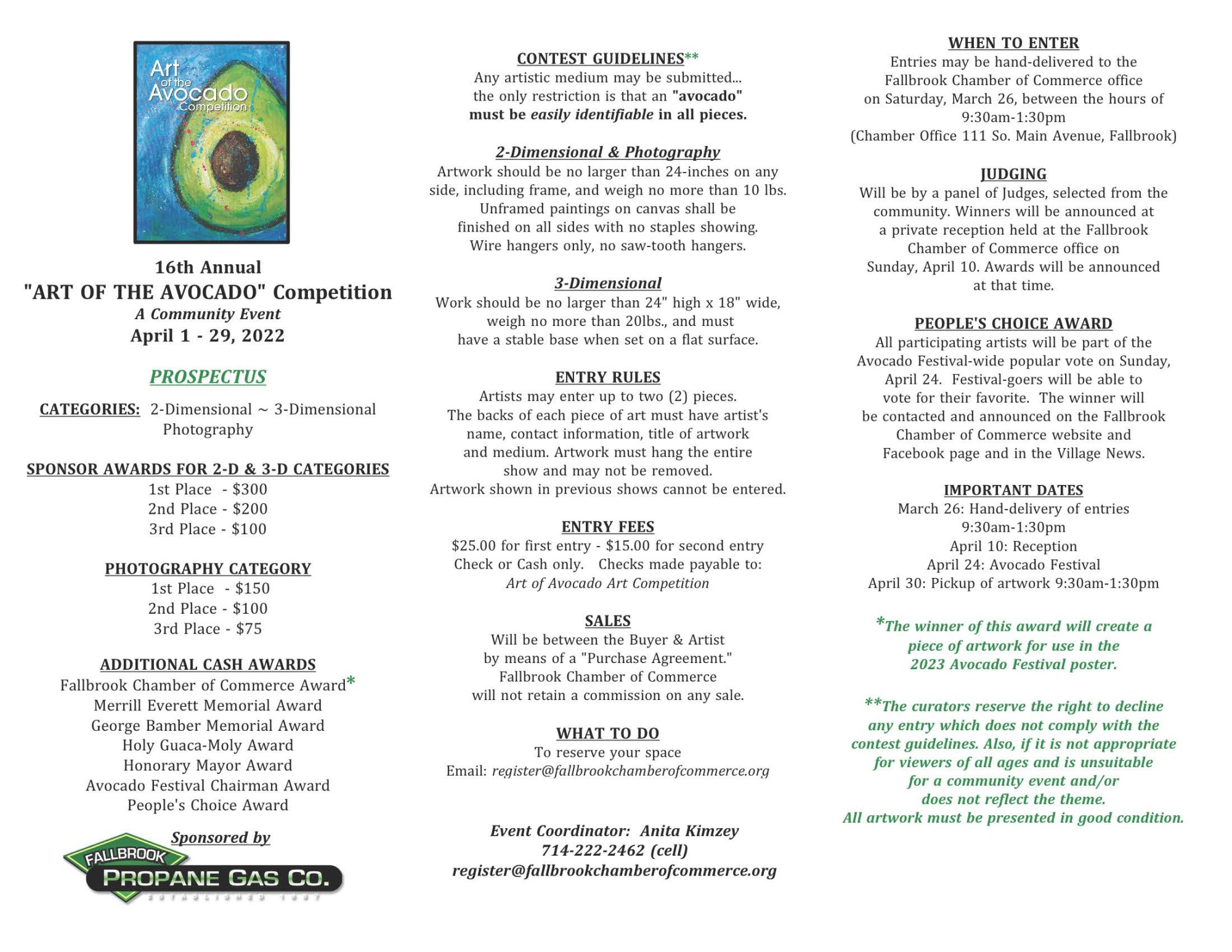 DEADLINE TO ENTER- March 26: Hand deliver entries 9:30-1:30April 10: ReceptionApril 24: Avocado FestivalApril 30: Art pick-up 9:30-1:30