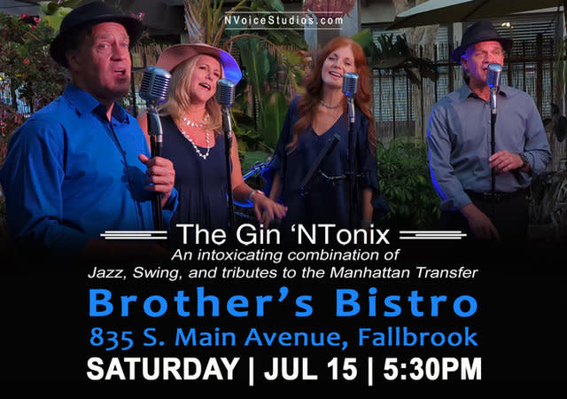 The Gin ‘NTonix are a high-octane quartet whose repertoire includes the tight harmonic vocals of Jazz, Swing, and tributes to the Manhattan Transfer. They serve up classic hits of yesterday and today, all with a Gin 'NTonix "twist". They are fast becoming a vocal jazz favorite at wineries, restaurants, and resorts from Orange County to San Diego. Gin ‘NTonix - Intoxicating jazz to raise your spirits…